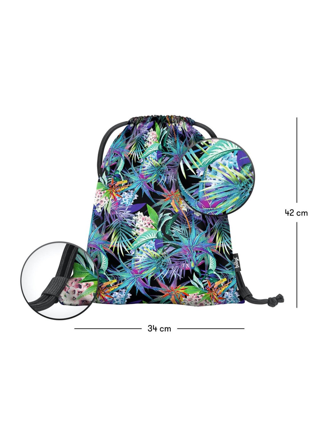 • Sáček na cvičky nebo přezůvky z pevného omyvatelného materiálu.• Zdrhování pomocí pevných tkanic, které zároveň umožňují nošení na zádech.