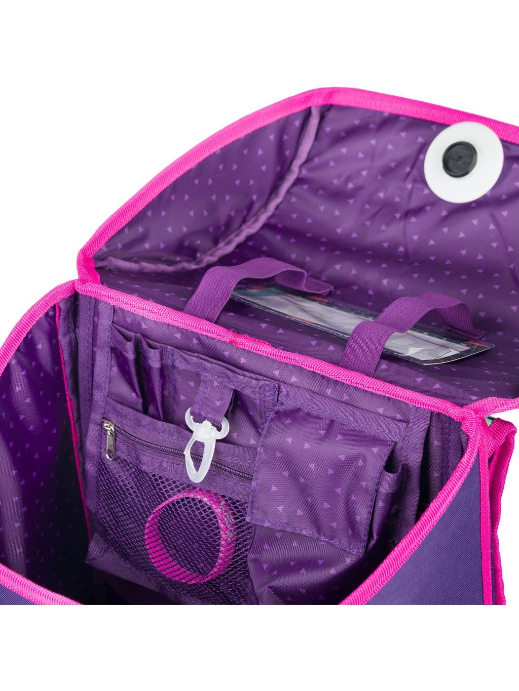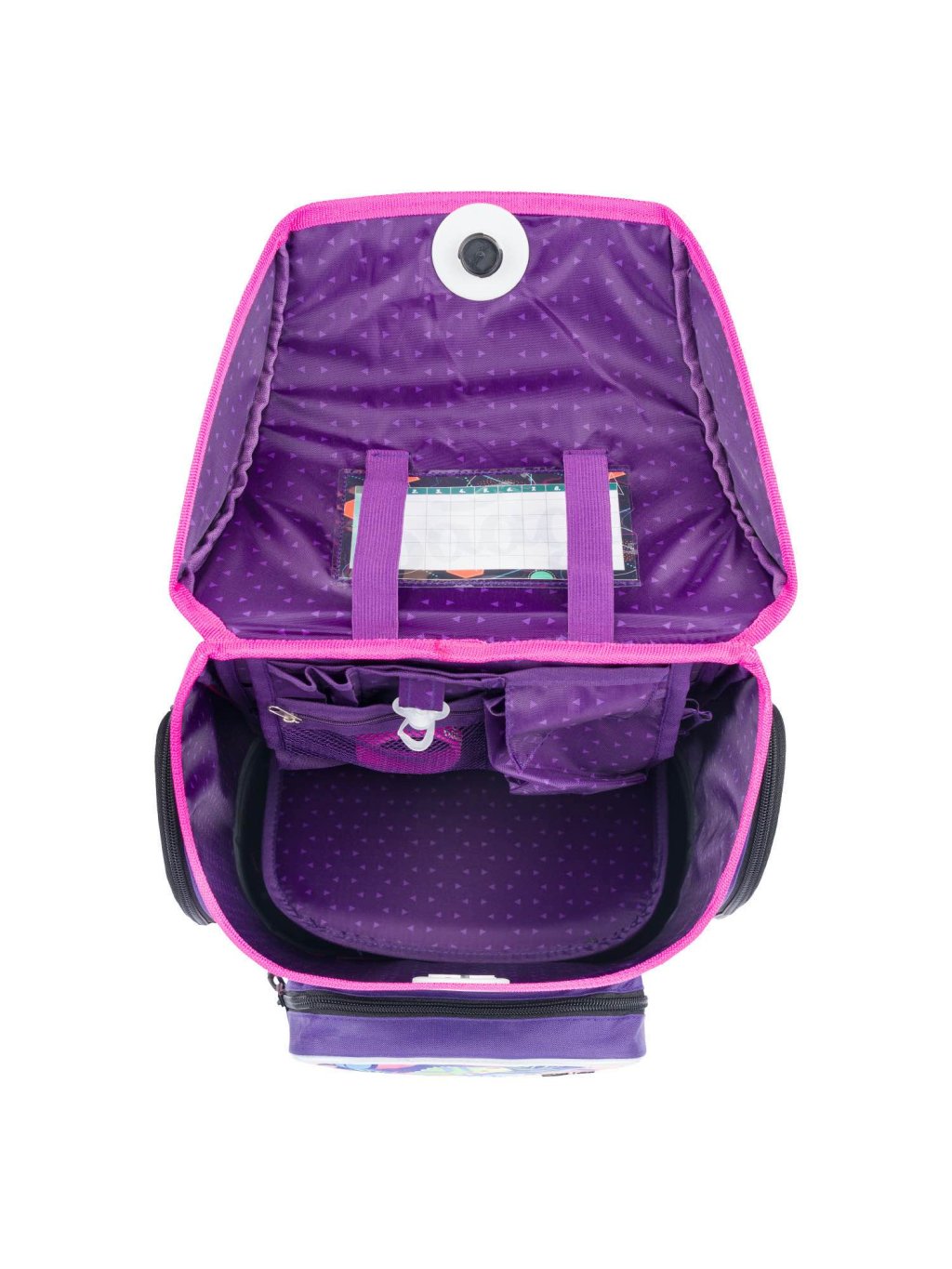 • Uvnitř aktovky je průhledná kapsa s rozvrhem a vnitřní organizér umožňující rovnoměrné rozložení hmotnosti.