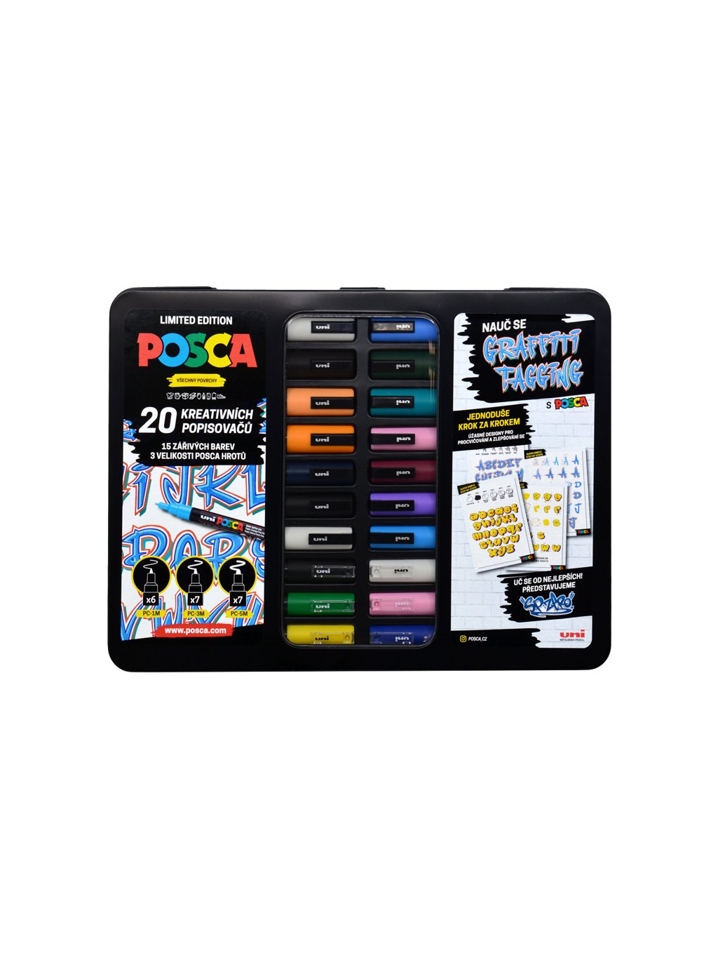 Limitovaná edice Posca Graffiti Tagging obsahuje 20 různobarevných popisovačů ve velikostech 1M, 3M a 5M, exkluzivní vzory od umělce SPZero, barevné návody dvou graffiti stylů a cvičné listy. Vše zabalené v praktické plechové krabičce, která je vhodná i jako dárkové balení. Obsahuje: 6ks PC-1M, 7ks PC-3M, 7ks PC-5M. Sytá barva, vynikající hustota. Vnitřní i venkovní použití. Po zaschnutí voděodolná. Vyrobeno v Japonsku.