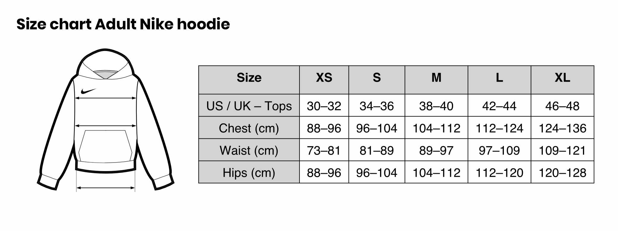 Size chart Adult Nike hoodie