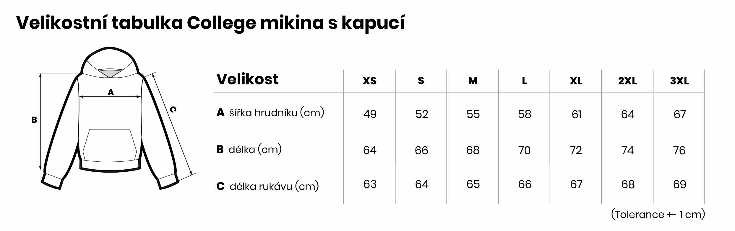 Velikostní tabulka College mikina s kapucí