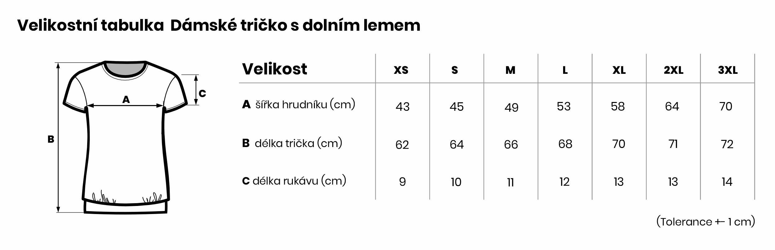 Velikostní tabulka Dámské tričko s dolním lemem