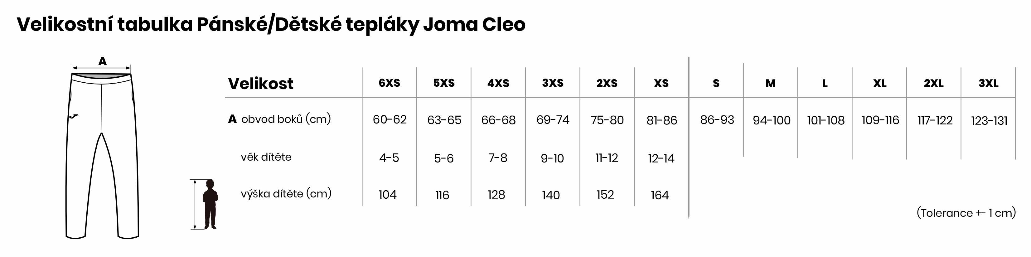 Velikostní tabulka Pánské/Dětské tepláky Joma Cleo